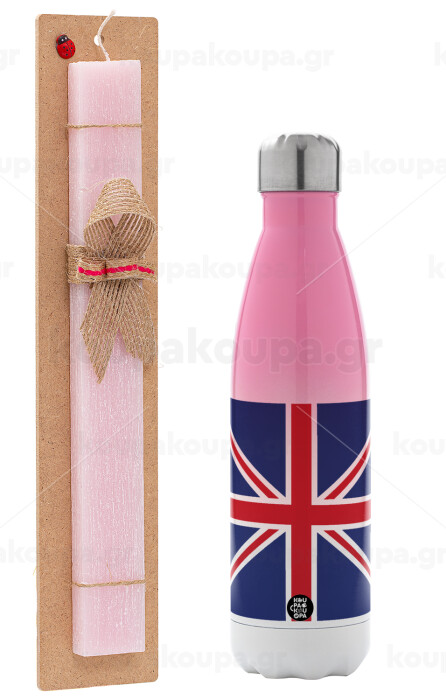 Σημαία Αγγλίας UK, Πασχαλινή Λαμπάδα με Μεταλλικό παγούρι θερμός Ροζ/Λευκό (Stainless steel), διπλού τοιχώματος, 500ml & κερί αρωματικό πλακέ (30cm) (ΡΟΖ)