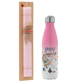 Χάρτης Ελλάδος, Πασχαλινή Λαμπάδα με Μεταλλικό παγούρι θερμός Ροζ/Λευκό (Stainless steel), διπλού τοιχώματος, 500ml & κερί αρωματικό πλακέ (30cm) (ΡΟΖ)
