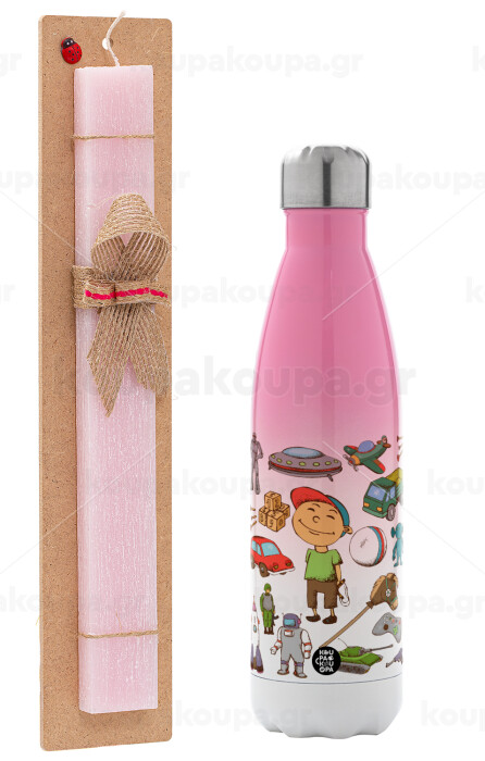 Toys Boy, Πασχαλινή Λαμπάδα με Μεταλλικό παγούρι θερμός Ροζ/Λευκό (Stainless steel), διπλού τοιχώματος, 500ml & κερί αρωματικό πλακέ (30cm) (ΡΟΖ)