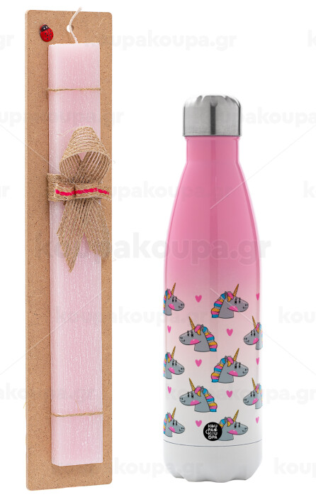 Unicorn, Πασχαλινή Λαμπάδα με Μεταλλικό παγούρι θερμός Ροζ/Λευκό (Stainless steel), διπλού τοιχώματος, 500ml & κερί αρωματικό πλακέ (30cm) (ΡΟΖ)