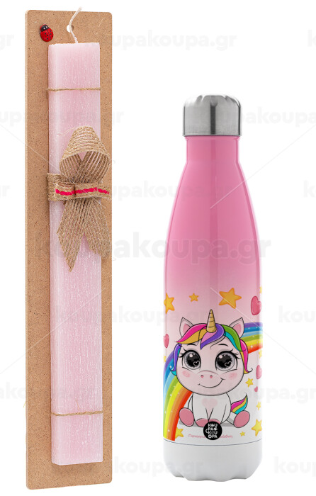 Unicorn baby με όνομα, Πασχαλινή Λαμπάδα με Μεταλλικό παγούρι θερμός Ροζ/Λευκό (Stainless steel), διπλού τοιχώματος, 500ml & κερί αρωματικό πλακέ (30cm) (ΡΟΖ)