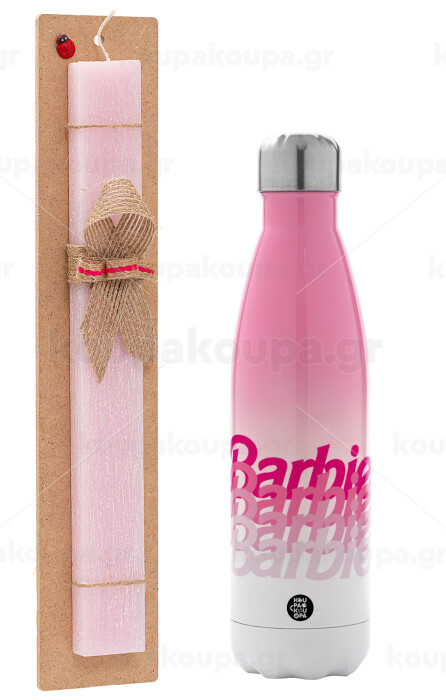 Barbie repeat, Πασχαλινή Λαμπάδα με Μεταλλικό παγούρι θερμός Ροζ/Λευκό (Stainless steel), διπλού τοιχώματος, 500ml & κερί αρωματικό πλακέ (30cm) (ΡΟΖ)