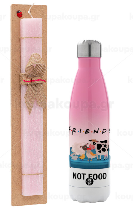 friends, not food, Πασχαλινή Λαμπάδα με Μεταλλικό παγούρι θερμός Ροζ/Λευκό (Stainless steel), διπλού τοιχώματος, 500ml & κερί αρωματικό πλακέ (30cm) (ΡΟΖ)