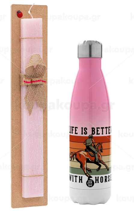 Life is Better with a Horse, Πασχαλινή Λαμπάδα με Μεταλλικό παγούρι θερμός Ροζ/Λευκό (Stainless steel), διπλού τοιχώματος, 500ml & κερί αρωματικό πλακέ (30cm) (ΡΟΖ)
