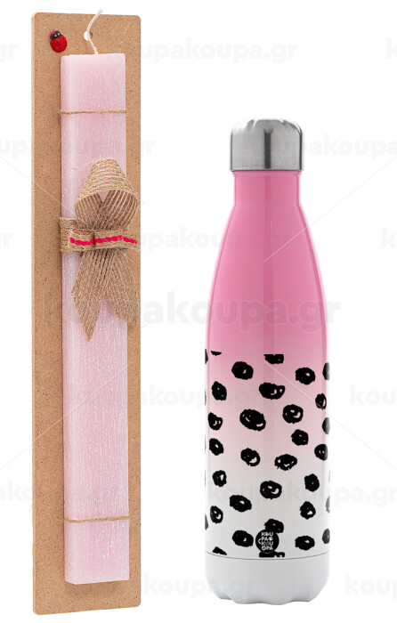 Doodle Dots, Πασχαλινή Λαμπάδα με Μεταλλικό παγούρι θερμός Ροζ/Λευκό (Stainless steel), διπλού τοιχώματος, 500ml & κερί αρωματικό πλακέ (30cm) (ΡΟΖ)