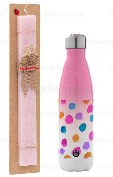 Watercolor dots, Πασχαλινή Λαμπάδα με Μεταλλικό παγούρι θερμός Ροζ/Λευκό (Stainless steel), διπλού τοιχώματος, 500ml & κερί αρωματικό πλακέ (30cm) (ΡΟΖ)