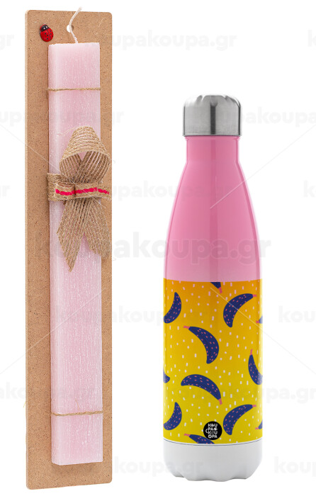 Yellow seamless with blue bananas, Πασχαλινή Λαμπάδα με Μεταλλικό παγούρι θερμός Ροζ/Λευκό (Stainless steel), διπλού τοιχώματος, 500ml & κερί αρωματικό πλακέ (30cm) (ΡΟΖ)