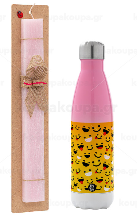 Smilies , Πασχαλινή Λαμπάδα με Μεταλλικό παγούρι θερμός Ροζ/Λευκό (Stainless steel), διπλού τοιχώματος, 500ml & κερί αρωματικό πλακέ (30cm) (ΡΟΖ)