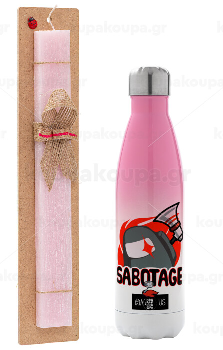 Among US Sabotage, Πασχαλινή Λαμπάδα με Μεταλλικό παγούρι θερμός Ροζ/Λευκό (Stainless steel), διπλού τοιχώματος, 500ml & κερί αρωματικό πλακέ (30cm) (ΡΟΖ)