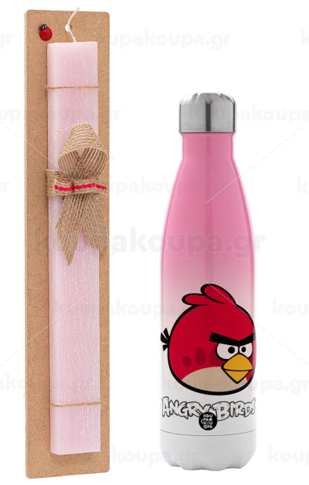 Angry birds Terence, Πασχαλινή Λαμπάδα με Μεταλλικό παγούρι θερμός Ροζ/Λευκό (Stainless steel), διπλού τοιχώματος, 500ml & κερί αρωματικό πλακέ (30cm) (ΡΟΖ)