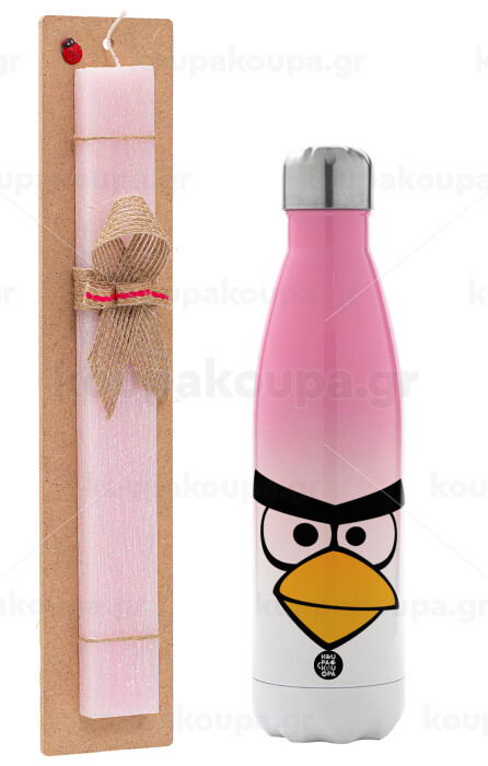 Angry birds eyes, Πασχαλινή Λαμπάδα με Μεταλλικό παγούρι θερμός Ροζ/Λευκό (Stainless steel), διπλού τοιχώματος, 500ml & κερί αρωματικό πλακέ (30cm) (ΡΟΖ)