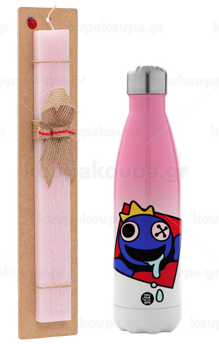 Blue, Rainbow friends, Πασχαλινή Λαμπάδα με Μεταλλικό παγούρι θερμός Ροζ/Λευκό (Stainless steel), διπλού τοιχώματος, 500ml & κερί αρωματικό πλακέ (30cm) (ΡΟΖ)