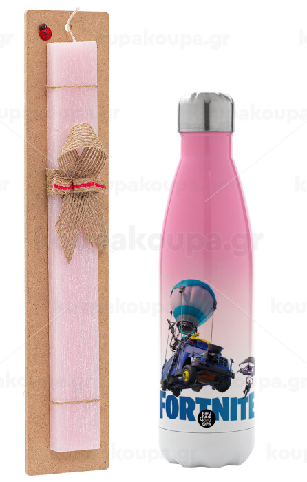 Fortnite Bus, Πασχαλινή Λαμπάδα με Μεταλλικό παγούρι θερμός Ροζ/Λευκό (Stainless steel), διπλού τοιχώματος, 500ml & κερί αρωματικό πλακέ (30cm) (ΡΟΖ)
