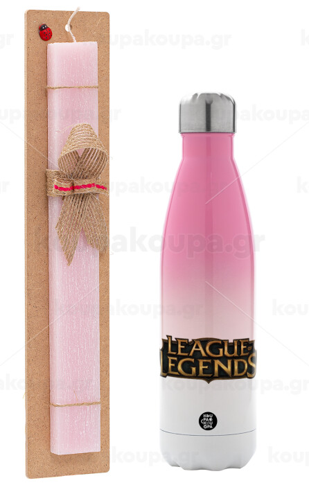 League of Legends LoL, Πασχαλινή Λαμπάδα με Μεταλλικό παγούρι θερμός Ροζ/Λευκό (Stainless steel), διπλού τοιχώματος, 500ml & κερί αρωματικό πλακέ (30cm) (ΡΟΖ)