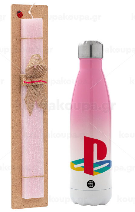 Playstation, Πασχαλινή Λαμπάδα με Μεταλλικό παγούρι θερμός Ροζ/Λευκό (Stainless steel), διπλού τοιχώματος, 500ml & κερί αρωματικό πλακέ (30cm) (ΡΟΖ)