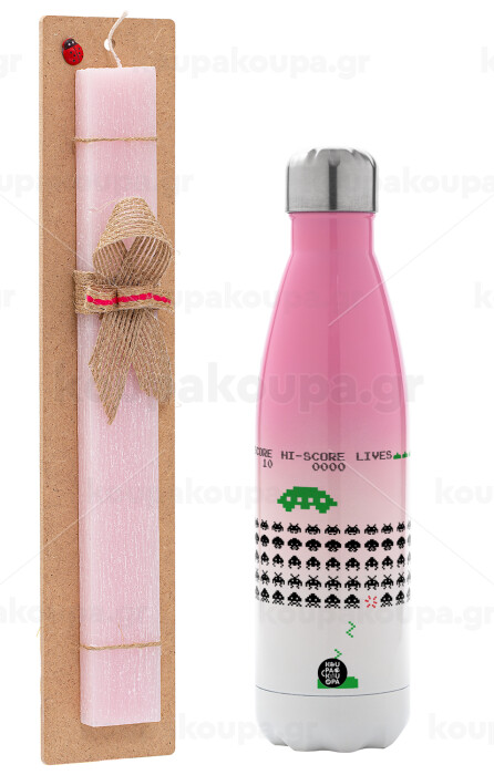 Space invaders, Πασχαλινή Λαμπάδα με Μεταλλικό παγούρι θερμός Ροζ/Λευκό (Stainless steel), διπλού τοιχώματος, 500ml & κερί αρωματικό πλακέ (30cm) (ΡΟΖ)