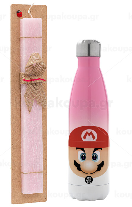 Super mario flat, Πασχαλινή Λαμπάδα με Μεταλλικό παγούρι θερμός Ροζ/Λευκό (Stainless steel), διπλού τοιχώματος, 500ml & κερί αρωματικό πλακέ (30cm) (ΡΟΖ)
