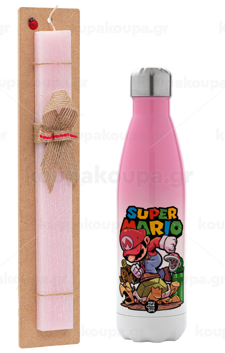 Super mario Jump, Πασχαλινή Λαμπάδα με Μεταλλικό παγούρι θερμός Ροζ/Λευκό (Stainless steel), διπλού τοιχώματος, 500ml & κερί αρωματικό πλακέ (30cm) (ΡΟΖ)
