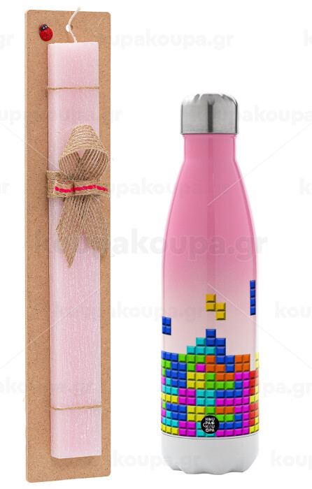 Tetris blocks, Πασχαλινή Λαμπάδα με Μεταλλικό παγούρι θερμός Ροζ/Λευκό (Stainless steel), διπλού τοιχώματος, 500ml & κερί αρωματικό πλακέ (30cm) (ΡΟΖ)