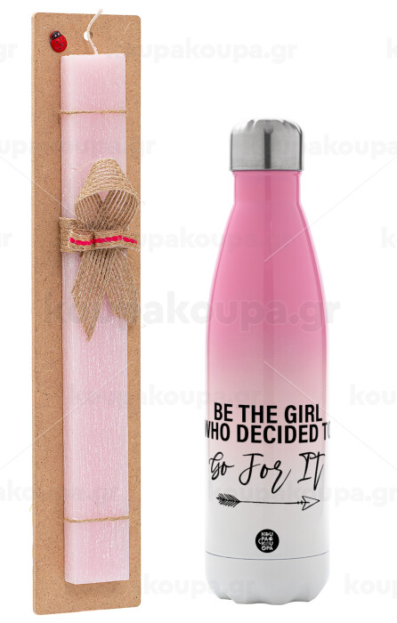 Be the girl who decided to, Πασχαλινή Λαμπάδα με Μεταλλικό παγούρι θερμός Ροζ/Λευκό (Stainless steel), διπλού τοιχώματος, 500ml & κερί αρωματικό πλακέ (30cm) (ΡΟΖ)