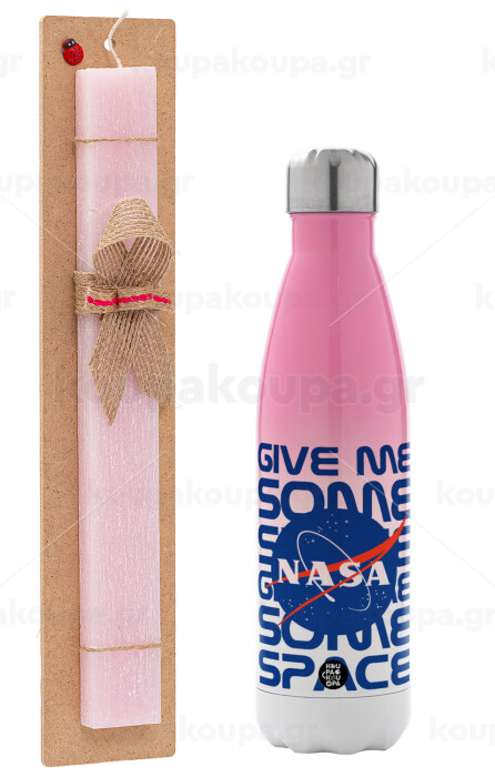 NASA give me some space, Πασχαλινή Λαμπάδα με Μεταλλικό παγούρι θερμός Ροζ/Λευκό (Stainless steel), διπλού τοιχώματος, 500ml & κερί αρωματικό πλακέ (30cm) (ΡΟΖ)