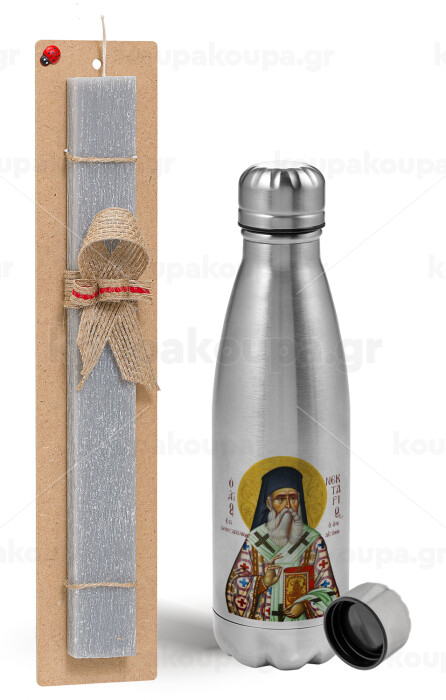 Άγιος Νεκτάριος, Πασχαλινή Λαμπάδα με μεταλλικό παγούρι Inox (750ml) & κερί αρωματικό πλακέ (30cm) (ΓΚΡΙ)