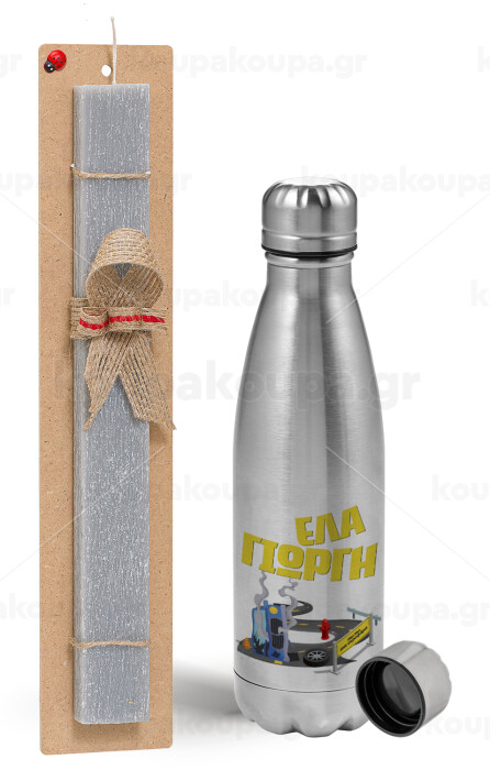 Έλα Γιώργη, πω πω μια στροφάρα, Πασχαλινή Λαμπάδα με μεταλλικό παγούρι Inox (750ml) & κερί αρωματικό πλακέ (30cm) (ΓΚΡΙ)