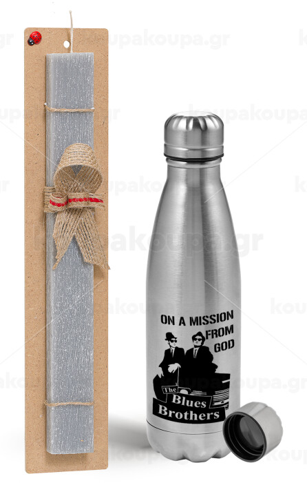 Blues brothers on a mission from God, Πασχαλινή Λαμπάδα με μεταλλικό παγούρι Inox (750ml) & κερί αρωματικό πλακέ (30cm) (ΓΚΡΙ)
