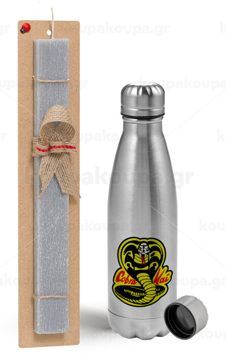 Cobra Kai Yellow, Πασχαλινή Λαμπάδα με μεταλλικό παγούρι Inox (750ml) & κερί αρωματικό πλακέ (30cm) (ΓΚΡΙ)