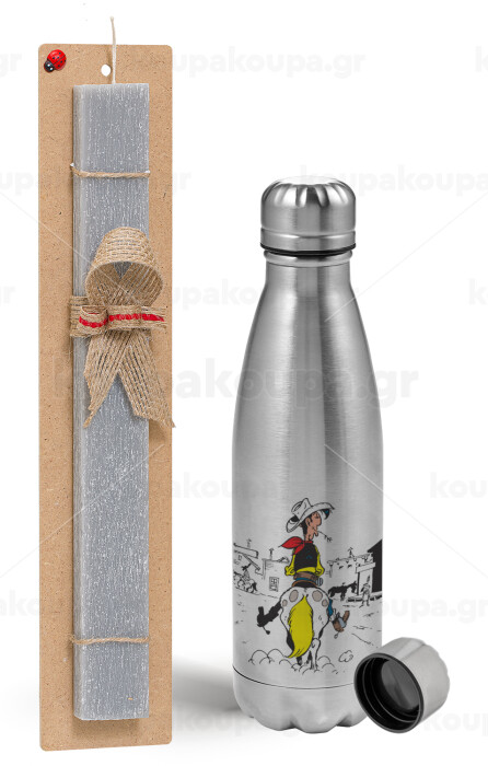 Λούκυ Λουκ comic, Πασχαλινή Λαμπάδα με μεταλλικό παγούρι Inox (750ml) & κερί αρωματικό πλακέ (30cm) (ΓΚΡΙ)