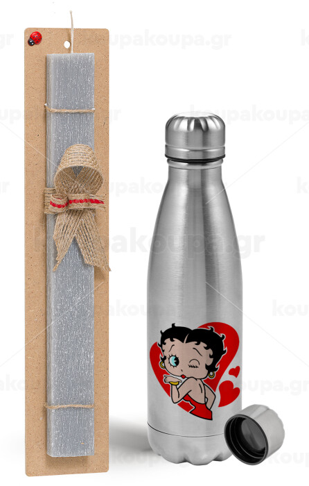 Betty Boop, Πασχαλινή Λαμπάδα με μεταλλικό παγούρι Inox (750ml) & κερί αρωματικό πλακέ (30cm) (ΓΚΡΙ)