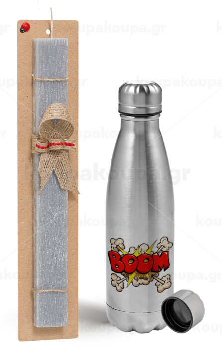 BOOM!!!, Πασχαλινή Λαμπάδα με μεταλλικό παγούρι Inox (750ml) & κερί αρωματικό πλακέ (30cm) (ΓΚΡΙ)