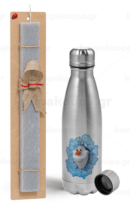Frozen Olaf, Πασχαλινή Λαμπάδα με μεταλλικό παγούρι Inox (750ml) & κερί αρωματικό πλακέ (30cm) (ΓΚΡΙ)