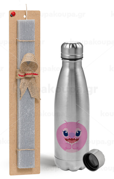 Lilo & Stitch Angel pink, Πασχαλινή Λαμπάδα με μεταλλικό παγούρι Inox (750ml) & κερί αρωματικό πλακέ (30cm) (ΓΚΡΙ)