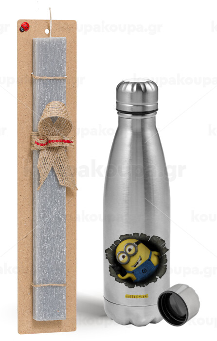 Minions hi, Πασχαλινή Λαμπάδα με μεταλλικό παγούρι Inox (750ml) & κερί αρωματικό πλακέ (30cm) (ΓΚΡΙ)
