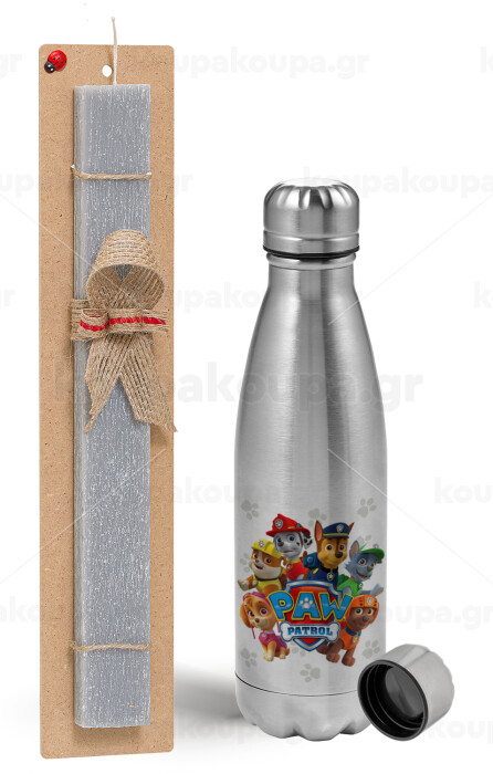 PAW patrol, τα κουτάβια, Πασχαλινή Λαμπάδα με μεταλλικό παγούρι Inox (750ml) & κερί αρωματικό πλακέ (30cm) (ΓΚΡΙ)