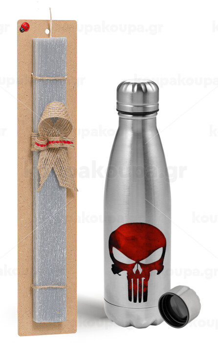 Red skull, Πασχαλινή Λαμπάδα με μεταλλικό παγούρι Inox (750ml) & κερί αρωματικό πλακέ (30cm) (ΓΚΡΙ)