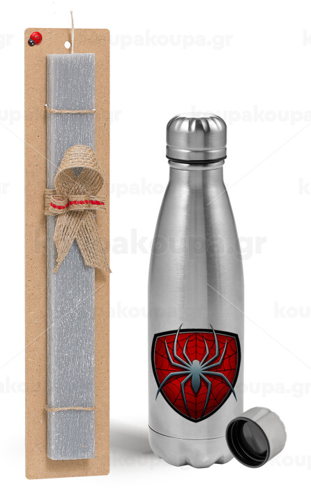 Spider-man, Πασχαλινή Λαμπάδα με μεταλλικό παγούρι Inox (750ml) & κερί αρωματικό πλακέ (30cm) (ΓΚΡΙ)