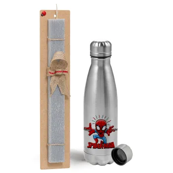 Spiderman flying, Πασχαλινή Λαμπάδα με μεταλλικό παγούρι Inox (750ml) & κερί αρωματικό πλακέ (30cm) (ΓΚΡΙ)