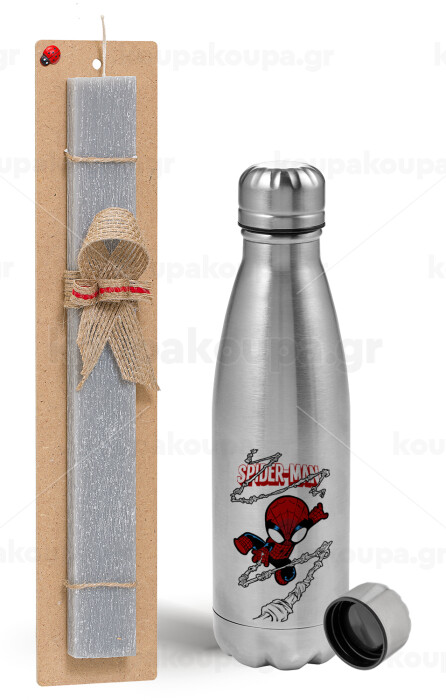 Spiderman kid, Πασχαλινή Λαμπάδα με μεταλλικό παγούρι Inox (750ml) & κερί αρωματικό πλακέ (30cm) (ΓΚΡΙ)