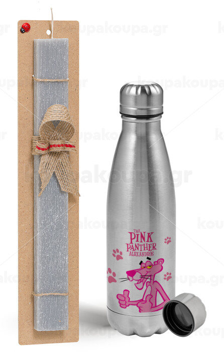 The pink panther, Πασχαλινή Λαμπάδα με μεταλλικό παγούρι Inox (750ml) & κερί αρωματικό πλακέ (30cm) (ΓΚΡΙ)