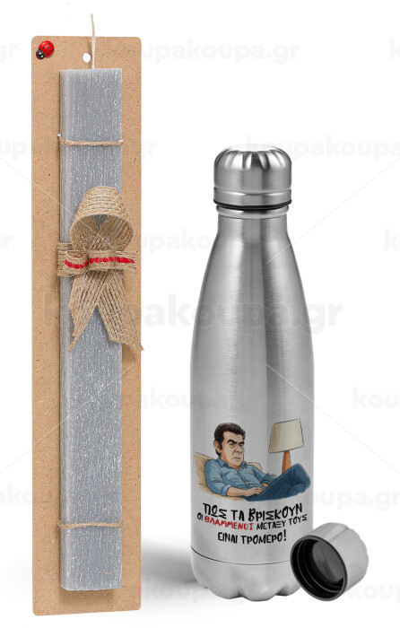 ΠΩΣ ΤΑ ΒΡΙΣΚΟΥΝ ΟΙ ΒΛΑ....ΝΟΙ ΜΕΤΑΞΥ ΤΟΥΣ, ΕΙΝΑΙ ΤΡΟΜΕΡΟ!!!, Πασχαλινή Λαμπάδα με μεταλλικό παγούρι Inox (750ml) & κερί αρωματικό πλακέ (30cm) (ΓΚΡΙ)