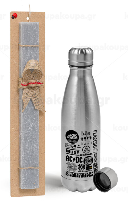Best Rock Bands Collection, Πασχαλινή Λαμπάδα με μεταλλικό παγούρι Inox (750ml) & κερί αρωματικό πλακέ (30cm) (ΓΚΡΙ)