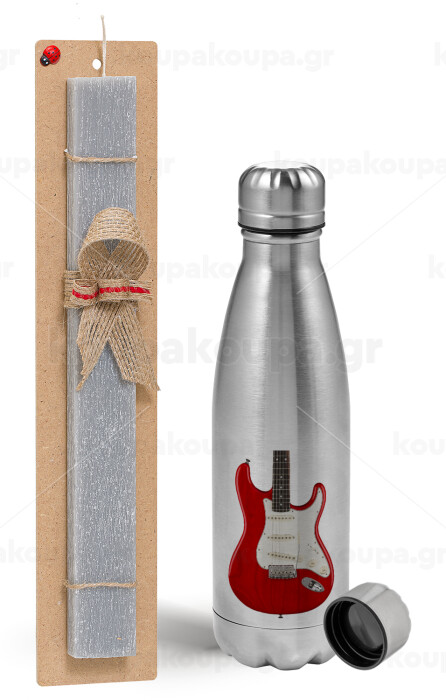 Guitar stratocaster, Πασχαλινή Λαμπάδα με μεταλλικό παγούρι Inox (750ml) & κερί αρωματικό πλακέ (30cm) (ΓΚΡΙ)