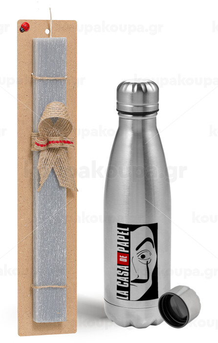 La casa de papel vertical, Πασχαλινή Λαμπάδα με μεταλλικό παγούρι Inox (750ml) & κερί αρωματικό πλακέ (30cm) (ΓΚΡΙ)