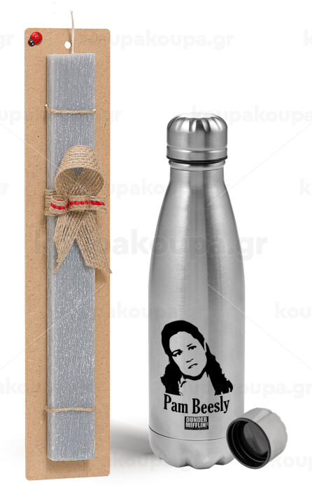 The office Pam Beesly, Πασχαλινή Λαμπάδα με μεταλλικό παγούρι Inox (750ml) & κερί αρωματικό πλακέ (30cm) (ΓΚΡΙ)