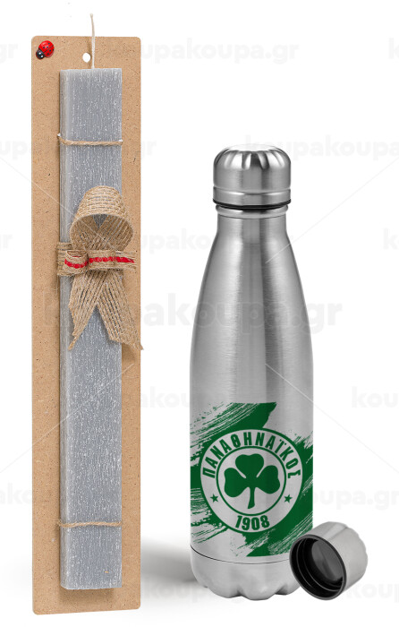 Π.Α.Ο., Πασχαλινή Λαμπάδα με μεταλλικό παγούρι Inox (750ml) & κερί αρωματικό πλακέ (30cm) (ΓΚΡΙ)
