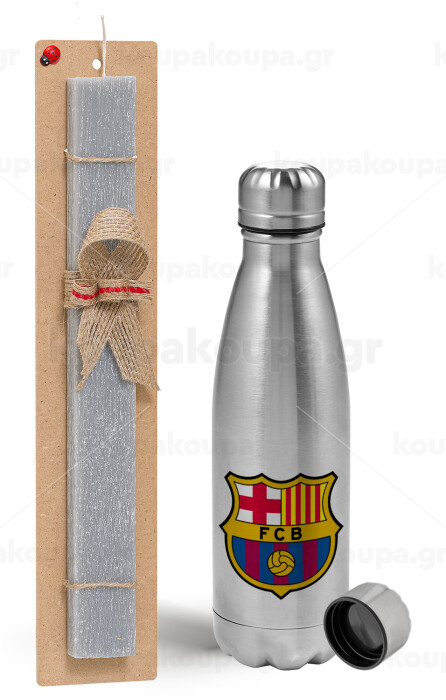 Barcelona FC, Πασχαλινή Λαμπάδα με μεταλλικό παγούρι Inox (750ml) & κερί αρωματικό πλακέ (30cm) (ΓΚΡΙ)