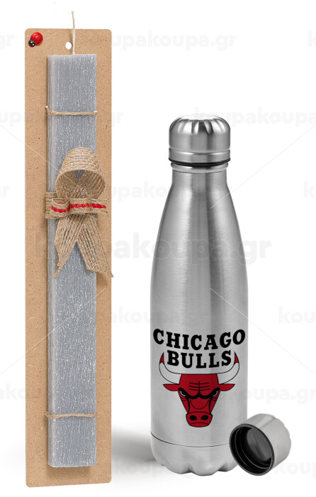 Chicago Bulls, Πασχαλινή Λαμπάδα με μεταλλικό παγούρι Inox (750ml) & κερί αρωματικό πλακέ (30cm) (ΓΚΡΙ)