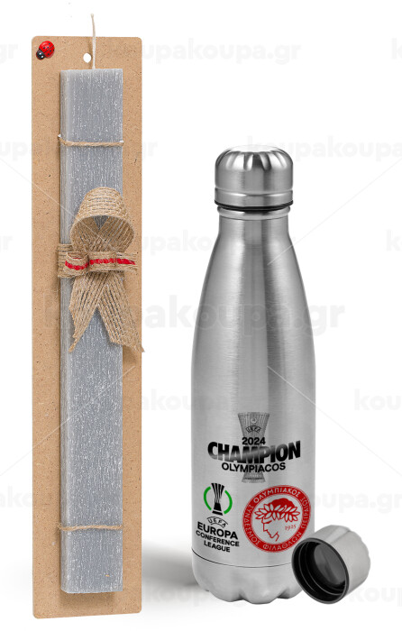 Olympiacos UEFA Europa Conference League Champion 2024, Πασχαλινή Λαμπάδα με μεταλλικό παγούρι Inox (750ml) & κερί αρωματικό πλακέ (30cm) (ΓΚΡΙ)
